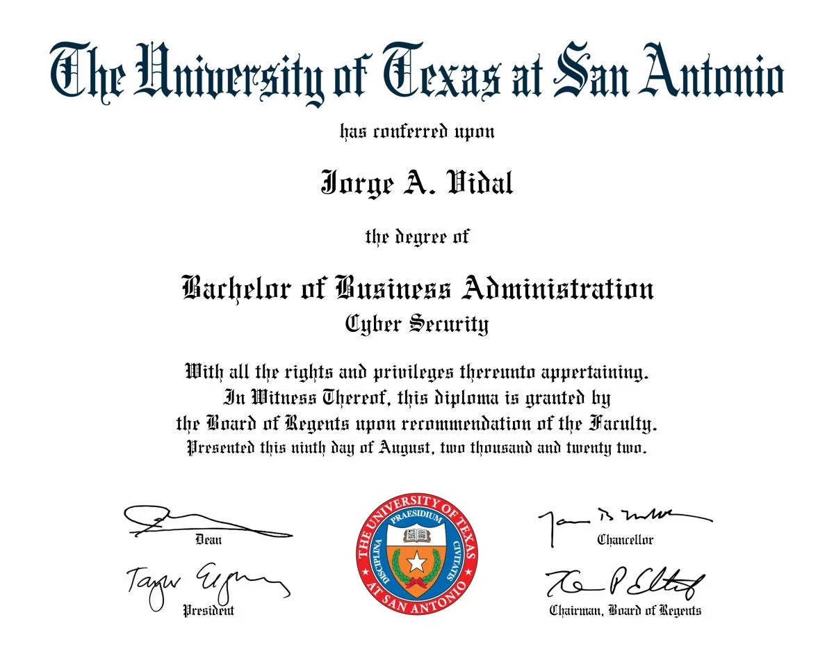 Earned from the University of Texas at San Antonio (UTSA), this degree provided me with a comprehensive education in both business principles and technical skills, preparing me for a dynamic and impactful career in cybersecurity.